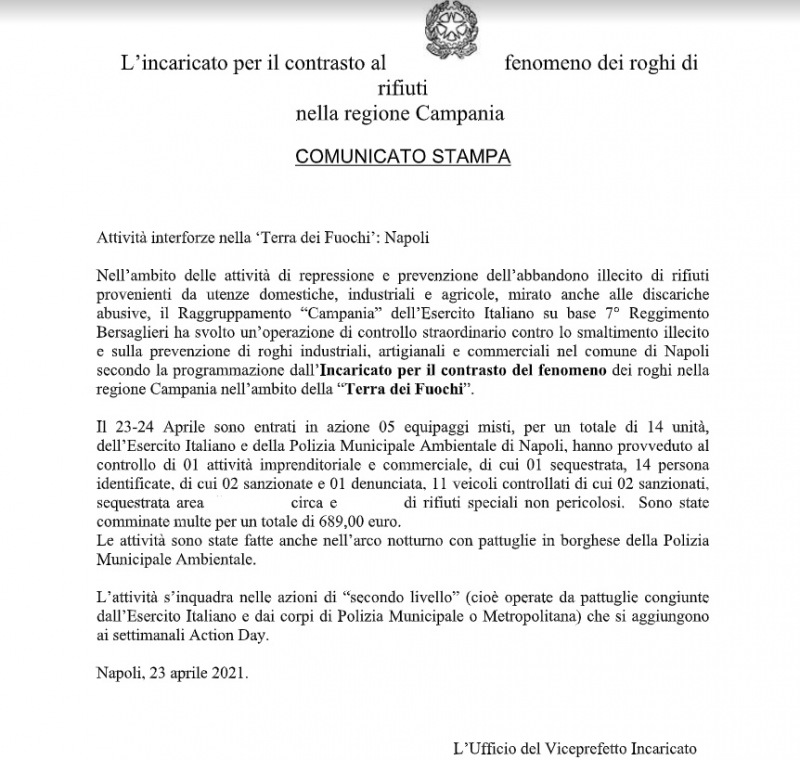 Questa parte della nota stampa dell'incaricato per il contrasto al fenomeno dei roghi di rifiuti nella regione Campania: