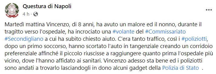 Questo quanto apprendiamo dalla pagina fb della Questura di Napoli: "Martedì mattina Vincenzo, di 8 anni, ha avuto un malore ed il nonno, durante il tragitto verso l'ospedale, ha incrociato una volante del Commissariato Secondigliano a cui ha subito chiesto aiuto. C’era tanto traffico - si legge nella nota -, così i poliziotti, dopo un primo soccorso, hanno scortato l'auto in tangenziale creando un corridoio preferenziale affinché il piccolo riuscisse a raggiungere quanto prima l’ospedale più vicino, dove l'hanno affidato ai sanitari. Vincenzo adesso sta bene ed i poliziotti sono andati a trovarlo lasciandogli in dono alcuni gadget della Polizia di Stato".