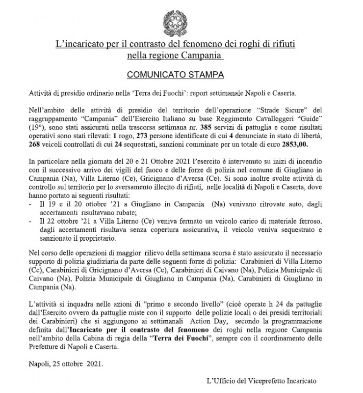 "Attività di presidio ordinario nella ‘Terra dei Fuochi’: report settimanale Napoli e Caserta. Nell’ambito delle attività di presidio del territorio dell’operazione “Strade Sicure” del raggruppamento “Campania” dell’Esercito Italiano su base Reggimento Cavalleggeri “Guide” (19°), sono stati assicurati nella trascorsa settimana nr. 385 servizi di pattuglia e come risultati operativi sono stati rilevati: 1 rogo, 273 persone identificate di cui 4 denunciate in stato di libertà, 268 veicoli controllati di cui 24 sequestrati, sanzioni comminate per un totale di euro 2853,00. -Si legge nella nota- In particolare nella giornata del 20 e 21 Ottobre 2021 l’esercito è intervenuto su inizi di incendio con il successivo arrivo dei vigili del fuoco e delle forze di polizia nel comune di Giugliano in Campania (Na), Villa Literno (Ce), Gricignano d’Aversa (Ce). Si sono inoltre svolte attività di controllo sul territorio per lo sversamento illecito di rifiuti, nelle località di Napoli e Caserta, dove hanno portato ai seguenti risultati: - Il 19 e il 20 ottobre ’21 a Giugliano in Campania (Na) venivano ritrovate auto, dagli accertamenti risultavano rubate; - Il 22 ottobre ’21 a Villa Literno (Ce) veniva fermato un veicolo carico di materiale ferroso, dagli accertamenti risultava senza copertura assicurativa, il veicolo veniva sequestrato e sanzionato il proprietario. Nel corso delle operazioni di maggior rilievo della settimana scorsa è stato assicurato il necessario supporto di polizia giudiziaria da parte delle seguenti forze di polizia: Carabinieri di Villa Literno (Ce), Carabinieri di Gricignano d’Aversa (Ce), Carabinieri di Caivano (Na), Polizia Municipale di Caivano (Na), Polizia Municipale di Giugliano in Campania (Na), Carabinieri di Giugliano in Campania (Na). -Si legge nella nota- L’attività si inquadra nelle azioni di “primo e secondo livello” (cioè operate h 24 da pattuglie dall’Esercito ovvero da pattuglie miste con il supporto delle polizie locali o dei presidi territoriali dei Carabinieri) che si aggiungono ai settimanali Action Day, secondo la programmazione definita dall’Incaricato per il contrasto del fenomeno dei roghi nella regione Campania nell’ambito della Cabina di regia della “Terra dei Fuochi”, sempre con il coordinamento delle Prefetture di Napoli e Caserta. Napoli, 25 ottobre 2021."