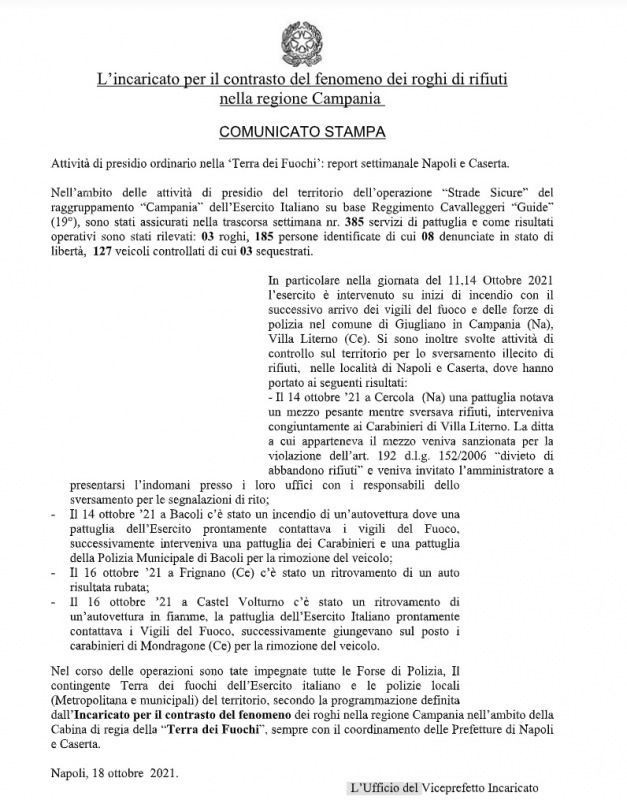 "Attività di presidio ordinario nella ‘Terra dei Fuochi’: report settimanale Napoli e Caserta. Nell’ambito delle attività di presidio del territorio dell’operazione “Strade Sicure” del raggruppamento “Campania” dell’Esercito Italiano su base Reggimento Cavalleggeri “Guide” (19°), sono stati assicurati nella trascorsa settimana nr. 385 servizi di pattuglia e come risultati operativi sono stati rilevati: 03 roghi, 185 persone identificate di cui 08 denunciate in stato di libertà, 127 veicoli controllati di cui 03 sequestrati. -Si legge nella nota- In particolare nella giornata del 11,14 Ottobre 2021 l’esercito è intervenuto su inizi di incendio con il successivo arrivo dei vigili del fuoco e delle forze di polizia nel comune di Giugliano in Campania (Na), Villa Literno (Ce). Si sono inoltre svolte attività di controllo sul territorio per lo sversamento illecito di rifiuti, nelle località di Napoli e Caserta, dove hanno portato ai seguenti risultati: - Il 14 ottobre ’21 a Cercola (Na) una pattuglia notava un mezzo pesante mentre sversava rifiuti, interveniva congiuntamente ai Carabinieri di Villa Literno. -Si legge nella nota- La ditta a cui apparteneva il mezzo veniva sanzionata per la violazione dell’art. 192 d.l.g. 152/2006 “divieto di abbandono rifiuti” e veniva invitato l’amministratore a presentarsi l’indomani presso i loro uffici con i responsabili dello sversamento per le segnalazioni di rito; - Il 14 ottobre ’21 a Bacoli c’è stato un incendio di un’autovettura dove una pattuglia dell’Esercito prontamente contattava i vigili del Fuoco, successivamente interveniva una pattuglia dei Carabinieri e una pattuglia della Polizia Municipale di Bacoli per la rimozione del veicolo; - Il 16 ottobre ’21 a Frignano (Ce) c’è stato un ritrovamento di un auto risultata rubata; - Il 16 ottobre ’21 a Castel Volturno c’è stato un ritrovamento di un’autovettura in fiamme, la pattuglia dell’Esercito Italiano prontamente contattava i Vigili del Fuoco, successivamente giungevano sul posto i carabinieri di Mondragone (Ce) per la rimozione del veicolo. -Si legge nella nota- Nel corso delle operazioni sono tate impegnate tutte le Forse di Polizia, Il contingente Terra dei fuochi dell’Esercito italiano e le polizie locali (Metropolitana e municipali) del territorio, secondo la programmazione definita dall’Incaricato per il contrasto del fenomeno dei roghi nella regione Campania nell’ambito della Cabina di regia della “Terra dei Fuochi”, sempre con il coordinamento delle Prefetture di Napoli e Caserta. Napoli, 18 ottobre 2021."
