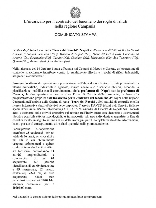 Questa parte della nota stampa dell'incaricato per il contrasto del fenomeno dei roghi di rifiuti nella Regione Campania:
