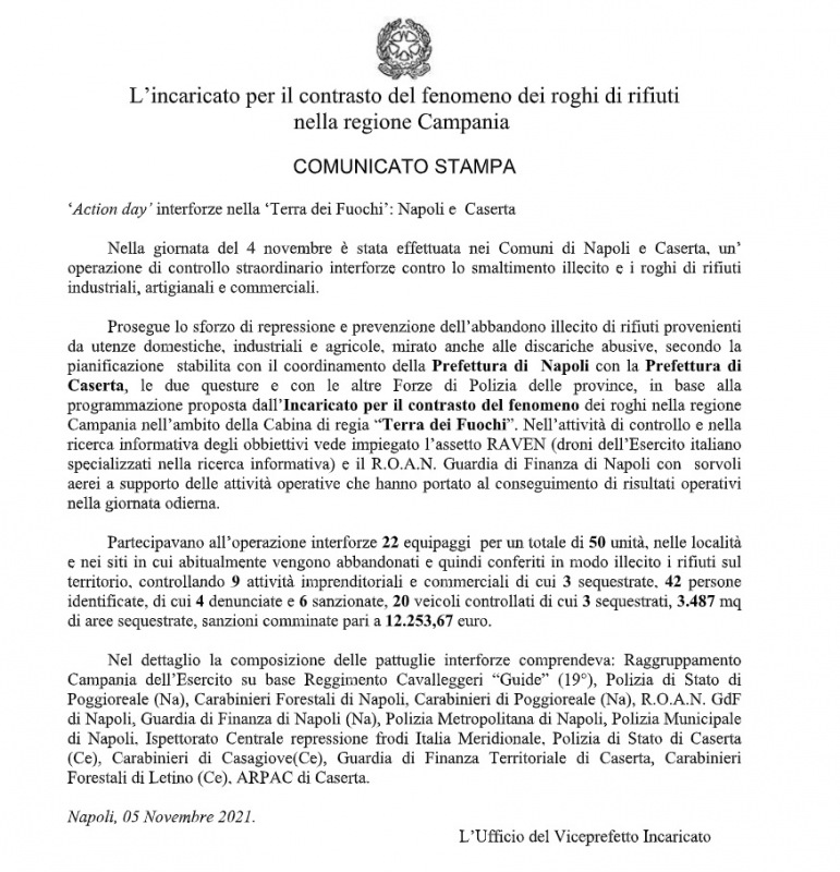 "‘Action day’ interforze nella ‘Terra dei Fuochi’: Napoli e Caserta Nella giornata del 4 novembre è stata effettuata nei Comuni di Napoli e Caserta, un’ operazione di controllo straordinario interforze contro lo smaltimento illecito e i roghi di rifiuti industriali, artigianali e commerciali. Prosegue lo sforzo di repressione e prevenzione dell’abbandono illecito di rifiuti provenienti da utenze domestiche, industriali e agricole, mirato anche alle discariche abusive, secondo la pianificazione stabilita con il coordinamento della Prefettura di Napoli con la Prefettura di Caserta, le due questure e con le altre Forze di Polizia delle province, -si legge nella nota- in base alla programmazione proposta dall’Incaricato per il contrasto del fenomeno dei roghi nella regione Campania nell’ambito della Cabina di regia “Terra dei Fuochi”. Nell’attività di controllo e nella ricerca informativa degli obbiettivi vede impiegato l’assetto RAVEN (droni dell’Esercito italiano specializzati nella ricerca informativa) e il R.O.A.N. Guardia di Finanza di Napoli con sorvoli aerei a supporto delle attività operative che hanno portato al conseguimento di risultati operativi nella giornata odierna. Partecipavano all’operazione interforze 22 equipaggi per un totale di 50 unità, nelle località e nei siti in cui abitualmente vengono abbandonati e quindi conferiti in modo illecito i rifiuti sul territorio, controllando 9 attività imprenditoriali e commerciali di cui 3 sequestrate, 42 persone identificate, di cui 4 denunciate e 6 sanzionate, 20 veicoli controllati di cui 3 sequestrati, 3.487 mq di aree sequestrate, sanzioni comminate pari a 12.253,67 euro. Nel dettaglio la composizione delle pattuglie interforze comprendeva: -si legge nella nota- Raggruppamento Campania dell’Esercito su base Reggimento Cavalleggeri “Guide” (19°), Polizia di Stato di Poggioreale (Na), Carabinieri Forestali di Napoli, Carabinieri di Poggioreale (Na), R.O.A.N. GdF di Napoli, Guardia di Finanza di Napoli (Na), Polizia Metropolitana di Napoli, Polizia Municipale di Napoli, Ispettorato Centrale repressione frodi Italia Meridionale, Polizia di Stato di Caserta (Ce), Carabinieri di Casagiove(Ce), Guardia di Finanza Territoriale di Caserta, Carabinieri Forestali di Letino (Ce), ARPAC di Caserta. Napoli, 05 Novembre 2021."