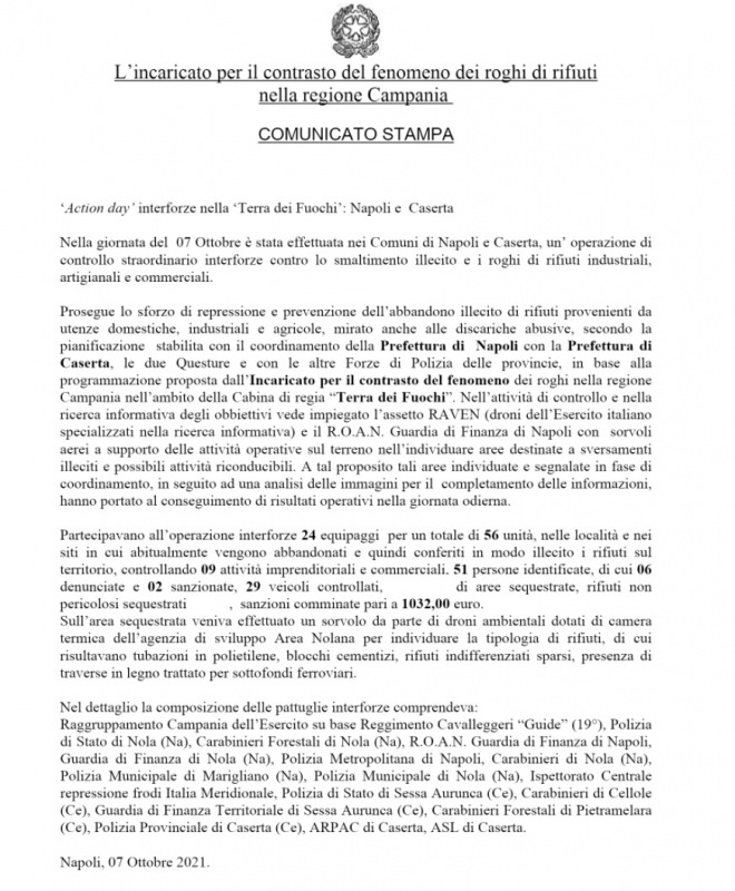 "Nella giornata del 07 Ottobre è stata effettuata nei Comuni di Napoli e Caserta, un’ operazione di controllo straordinario interforze contro lo smaltimento illecito e i roghi di rifiuti industriali, artigianali e commerciali. Prosegue lo sforzo di repressione e prevenzione dell’abbandono illecito di rifiuti provenienti da utenze domestiche, industriali e agricole, mirato anche alle discariche abusive, secondo la pianificazione stabilita con il coordinamento della Prefettura di Napoli con la Prefettura di Caserta, le due Questure e con le altre Forze di Polizia delle provincie, in base alla programmazione proposta dall’Incaricato per il contrasto del fenomeno dei roghi nella regione Campania nell’ambito della Cabina di regia “Terra dei Fuochi”. -Si legge nella nota- Nell’attività di controllo e nella ricerca informativa degli obbiettivi vede impiegato l’assetto RAVEN (droni dell’Esercito italiano specializzati nella ricerca informativa) e il R.O.A.N. Guardia di Finanza di Napoli con sorvoli aerei a supporto delle attività operative sul terreno nell’individuare aree destinate a sversamenti illeciti e possibili attività riconducibili. A tal proposito tali aree individuate e segnalate in fase di coordinamento, in seguito ad una analisi delle immagini per il completamento delle informazioni, hanno portato al conseguimento di risultati operativi nella giornata odierna. -Si legge nella nota- Partecipavano all’operazione interforze 24 equipaggi per un totale di 56 unità, nelle località e nei siti in cui abitualmente vengono abbandonati e quindi conferiti in modo illecito i rifiuti sul territorio, controllando 09 attività imprenditoriali e commerciali, 51 persone identificate, di cui 06 denunciate e 02 sanzionate, 29 veicoli controllati, ... di aree sequestrate, rifiuti non pericolosi sequestrati ... , sanzioni comminate pari a 1032,00 euro. Sull’area sequestrata veniva effettuato un sorvolo da parte di droni ambientali dotati di camera termica dell’agenzia di sviluppo Area Nolana per individuare la tipologia di rifiuti, di cui risultavano tubazioni in polietilene, blocchi cementizi, rifiuti indifferenziati sparsi, presenza di traverse in legno trattato per sottofondi ferroviari. -Si legge nella nota- Nel dettaglio la composizione delle pattuglie interforze comprendeva: Raggruppamento Campania dell’Esercito su base Reggimento Cavalleggeri “Guide” (19°), Polizia di Stato di Nola (Na), Carabinieri Forestali di Nola (Na), R.O.A.N. Guardia di Finanza di Napoli, Guardia di Finanza di Nola (Na), Polizia Metropolitana di Napoli, Carabinieri di Nola (Na), Polizia Municipale di Marigliano (Na), Polizia Municipale di Nola (Na), Ispettorato Centrale repressione frodi Italia Meridionale, Polizia di Stato di Sessa Aurunca (Ce), Carabinieri di Cellole (Ce), Guardia di Finanza Territoriale di Sessa Aurunca (Ce), Carabinieri Forestali di Pietramelara (Ce), Polizia Provinciale di Caserta (Ce), ARPAC di Caserta, ASL di Caserta."