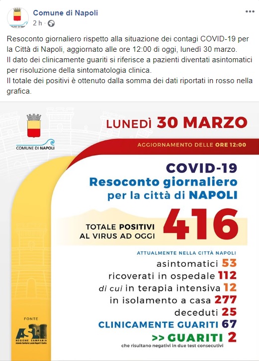 Questo quanto pubblicato sulla pagina facebook del Comune di Napoli: