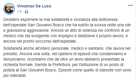 Questo il post pubblicato su Facebook dal Presidente della Regione Campania Vincenzo De Luca:
