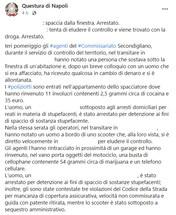 "#Secondigliano : spaccia dalla finestra. Arrestato ... : tenta di eludere il controllo e viene trovato con la droga. Arrestato. Ieri pomeriggio gli #agenti del #Commissariato Secondigliano, durante il servizio di controllo del territorio, nel transitare in ... hanno notato una persona che sostava sotto la finestra di un’abitazione e, dopo un breve colloquio con un uomo che si era affacciato, ha ricevuto qualcosa in cambio di denaro e si è allontanata. -Si legge nella nota- I #poliziotti sono entrati nell’appartamento dello spacciatore dove hanno rinvenuto 11 involucri contenenti 2,5 grammi circa di cocaina e 35 euro. L’uomo, ... sottoposto agli arresti domiciliari per reati in materia di stupefacenti, è stato arrestato per detenzione ai fini di spaccio di sostanza stupefacente. Nella stessa serata gli operatori, nel transitare in ... , hanno notato un uomo a bordo di uno scooter che, alla loro vista, si è diretto velocemente in ... per eludere il controllo. Gli agenti l’hanno rintracciato in prossimità di un garage ed hanno rinvenuto, nel vano porta oggetti del motociclo, una busta di cellophane contenente 54 grammi circa di marijuana e un telefono cellulare. -Si legge nella nota- L’uomo, ... , è stato arrestato per detenzione ai fini di spaccio di sostanze stupefacenti; inoltre, gli sono state contestate tre violazioni del Codice della Strada per mancanza di copertura assicurativa, velocità non commisurata e guida con patente ritirata, mentre lo scooter è stato sottoposto a sequestro amministrativo."