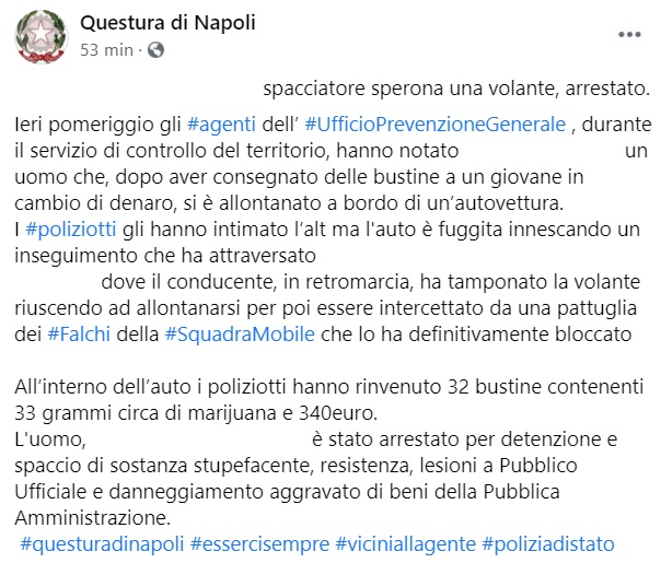 Questo parte di quanto apprendiamo dalla pagina facebook della Questura di Napoli:
