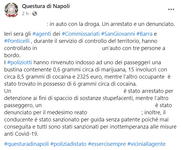 Questo parte di quanto pubblicato sulla pagina facebook della Questura di Napoli: