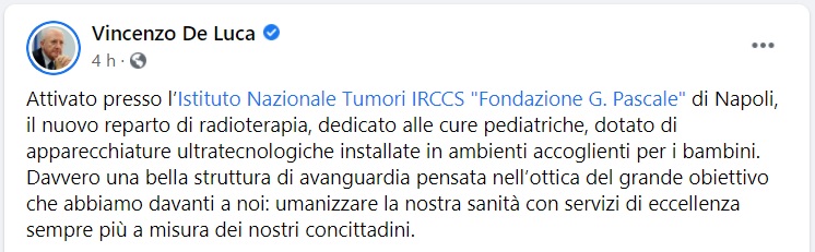 Questo quanto pubblicato sulla pagina fb del Pres. De Luca