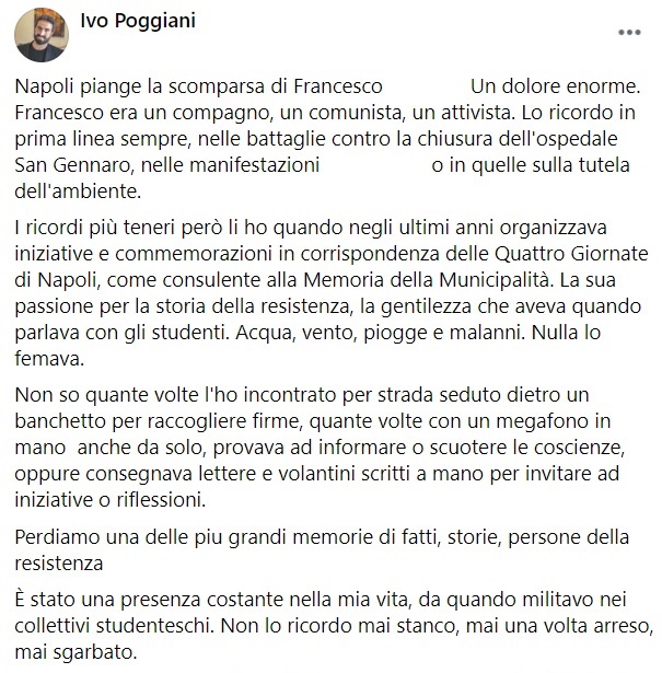 Questo quanto pubblicato sulla pagina facebook del Presidente della III Municipalità di Napoli Ivo Poggiani