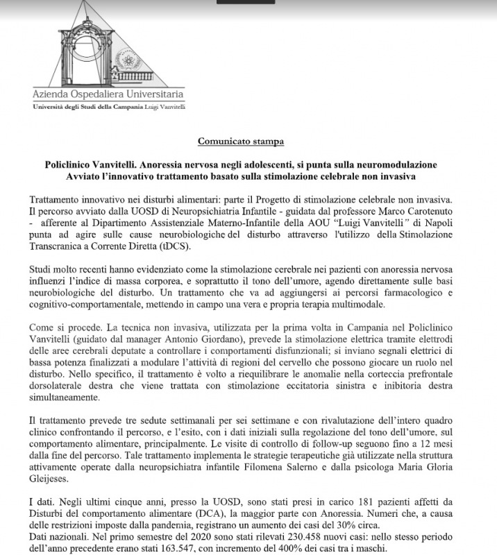 "Policlinico Vanvitelli. Anoressia nervosa negli adolescenti, si punta sulla neuromodulazione. Avviato l’innovativo trattamento basato sulla stimolazione celebrale non invasiva. Trattamento innovativo nei disturbi alimentari: parte il Progetto di stimolazione celebrale non invasiva. Il percorso avviato dalla UOSD di Neuropsichiatria Infantile - guidata dal professore Marco Carotenuto - afferente al Dipartimento Assistenziale Materno-Infantile della AOU “Luigi Vanvitelli” di Napoli punta ad agire- si legge nella nota- sulle cause neurobiologiche del disturbo attraverso l'utilizzo della Stimolazione Transcranica a Corrente Diretta (tDCS). Studi molto recenti hanno evidenziato come la stimolazione cerebrale nei pazienti con anoressia nervosa influenzi l’indice di massa corporea, e soprattutto il tono dell’umore, agendo direttamente sulle basi neurobiologiche del disturbo. Un trattamento che va ad aggiungersi ai percorsi farmacologico e cognitivo-comportamentale, mettendo in campo una vera e propria terapia multimodale. Come si procede. La tecnica non invasiva, utilizzata per la prima volta in Campania nel Policlinico Vanvitelli (guidato dal manager Antonio Giordano), prevede la stimolazione elettrica tramite elettrodi delle aree cerebrali deputate a controllare i comportamenti disfunzionali; si inviano segnali elettrici di bassa potenza finalizzati a modulare- si legge nella nota- l’attività di regioni del cervello che possono giocare un ruolo nel disturbo. Nello specifico, il trattamento è volto a riequilibrare le anomalie nella corteccia prefrontale dorsolaterale destra che viene trattata con stimolazione eccitatoria sinistra e inibitoria destra simultaneamente. Il trattamento prevede tre sedute settimanali per sei settimane e con rivalutazione dell’intero quadro clinico confrontando il percorso, e l’esito, con i dati iniziali sulla regolazione del tono dell’umore, sul comportamento alimentare, principalmente. Le visite di controllo di follow-up seguono fino a 12 mesi dalla fine del percorso. Tale trattamento implementa le strategie terapeutiche già utilizzate nella struttura attivamente operate dalla neuropsichiatra infantile Filomena Salerno e dalla psicologa Maria Gloria Gleijeses. I dati. Negli ultimi cinque anni, presso la UOSD, sono stati presi in carico 181 pazienti affetti da Disturbi del comportamento alimentare (DCA), la maggior parte con Anoressia. Numeri che, a causa delle restrizioni imposte dalla pandemia, registrano- si legge nella nota- un aumento dei casi del 30% circa. Dati nazionali. Nel primo semestre del 2020 sono stati rilevati 230.458 nuovi casi: nello stesso periodo dell’anno precedente erano stati 163.547, con incremento del 400% dei casi tra i maschi."