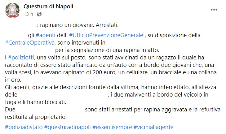 Questo parte di quanto pubblicato sulla pagina facebook della Questura di Napoli: