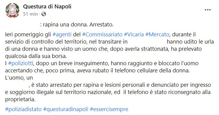 Questo parte di quanto pubblicato sulla pagina facebook della Questura di Napoli: