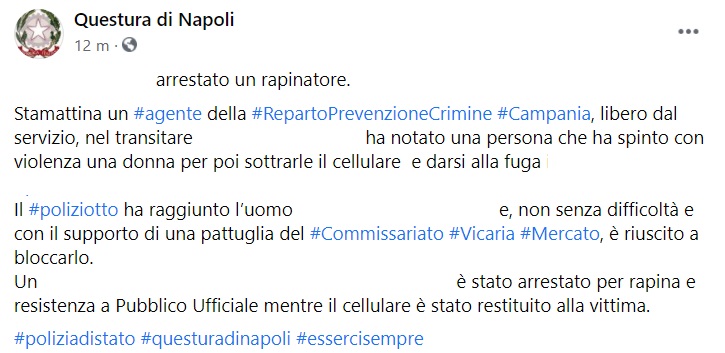 "... arrestato un rapinatore. Stamattina un #agente della #RepartoPrevenzioneCrimine #Campania, libero dal servizio, nel transitare ... ha notato una persona che ha spinto con violenza una donna per poi sottrarle il cellulare e darsi alla fuga ... Il #poliziotto- si legge nella nota- ha raggiunto l’uomo ... e, non senza difficoltà e con il supporto di una pattuglia del #Commissariato #Vicaria #Mercato, è riuscito a bloccarlo. Un ... è stato arrestato per rapina e resistenza a Pubblico Ufficiale mentre il cellulare è stato restituito alla vittima."