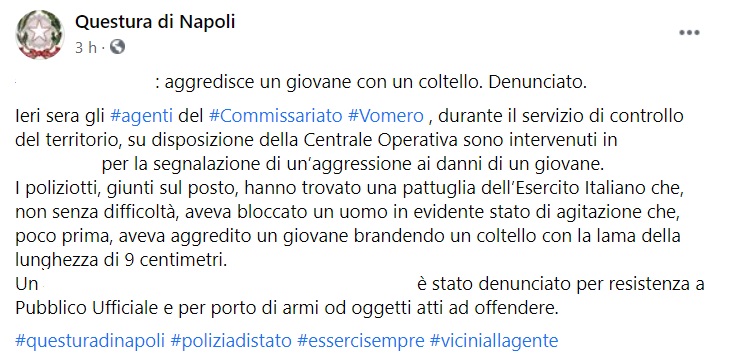 "... aggredisce un giovane con un coltello. Denunciato. Ieri sera gli #agenti del #Commissariato #Vomero , durante il servizio di controllo del territorio, su disposizione della Centrale Operativa sono intervenuti in ... per la segnalazione di un’aggressione ai danni di un giovane. I poliziotti, giunti sul posto, hanno trovato una pattuglia dell’Esercito Italiano che, -si legge nella nota- non senza difficoltà, aveva bloccato un uomo in evidente stato di agitazione che, poco prima, aveva aggredito un giovane brandendo un coltello con la lama della lunghezza di 9 centimetri. Un ... è stato denunciato per resistenza a Pubblico Ufficiale e per porto di armi od oggetti atti ad offendere."