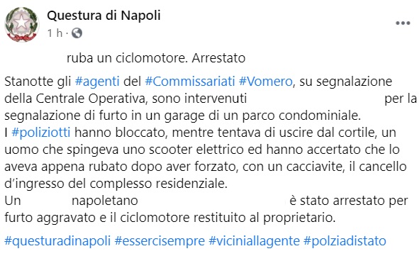 Questo parte di quanto apprendiamo dalla pagina facebook della Questura di Napoli: