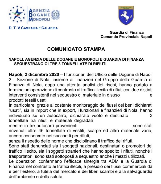 Pubblichiamo nota stampa Comando Provinciale della Guardia di Finanza di Napoli e dall’Agenzia delle Dogane e dei Monopoli