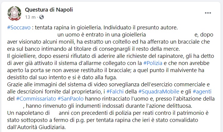 Questo quanto pubblicato sulla pagina facebook della Questura di Napoli: "Soccavo: tentata rapina in gioielleria. Individuato il presunto autore.