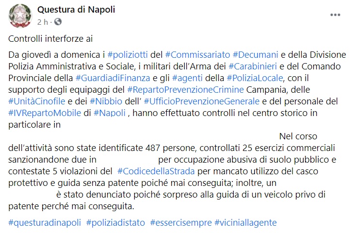 Questo parte di quanto pubblicato sulla pagina facebook della Questura di Napoli: