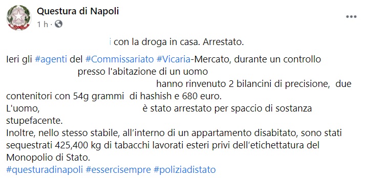 "...con la droga in casa. Arrestato. Ieri gli #agenti del #Commissariato #Vicaria-Mercato, durante un controllo ... presso l'abitazione di un uomo ... hanno rinvenuto 2 bilancini di precisione, due contenitori con 54g grammi di hashish e 680 euro. L'uomo, ... è stato- si legge nella nota- arrestato per spaccio di sostanza stupefacente. Inoltre, nello stesso stabile, all’interno di un appartamento disabitato, sono stati sequestrati 425,400 kg di tabacchi lavorati esteri privi dell’etichettatura del Monopolio di Stato."