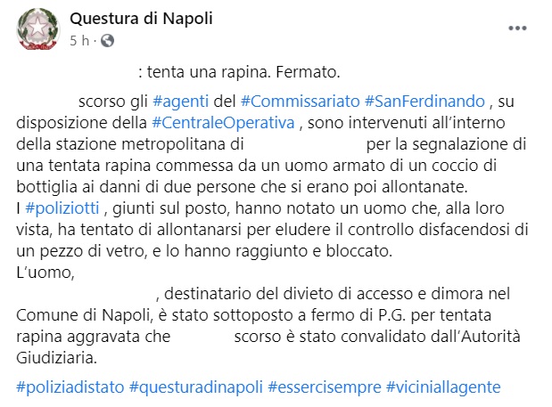 "... tenta una rapina. Fermato ... scorso gli #agenti del #Commissariato #SanFerdinando , su disposizione della #CentraleOperativa , sono intervenuti all’interno della stazione metropolitana di ... per la segnalazione di una tentata rapina commessa da un uomo armato di un coccio di bottiglia ai danni di due persone che si erano poi allontanate. -Si legge nella nota- I #poliziotti , giunti sul posto, hanno notato un uomo che, alla loro vista, ha tentato di allontanarsi per eludere il controllo disfacendosi di un pezzo di vetro, e lo hanno raggiunto e bloccato. -Si legge nella nota- L’uomo, ... destinatario del divieto di accesso e dimora nel Comune di Napoli, è stato sottoposto a fermo di P.G. per tentata rapina aggravata che ... scorso è stato convalidato dall’Autorità Giudiziaria."