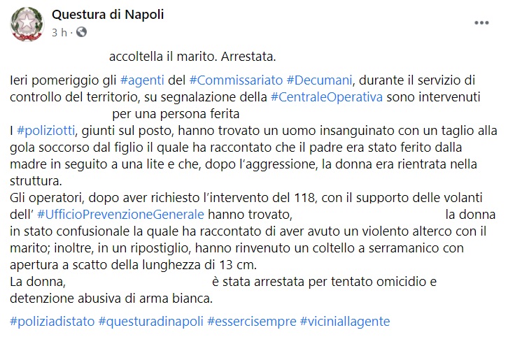 "... accoltella il marito. Arrestata. Ieri pomeriggio gli #agenti del #Commissariato #Decumani, durante il servizio di controllo del territorio, su segnalazione della #CentraleOperativa sono intervenuti ... per una persona ferita ... I #poliziotti, giunti sul posto, hanno trovato- si legge nella nota- un uomo insanguinato con un taglio alla gola soccorso dal figlio il quale ha raccontato che il padre era stato ferito dalla madre in seguito a una lite e che, dopo l’aggressione, la donna era rientrata nella struttura. Gli operatori, dopo aver richiesto l’intervento del 118, con il supporto delle volanti dell’ #UfficioPrevenzioneGenerale hanno trovato,... la donna in stato confusionale la quale ha raccontato di aver avuto un violento alterco con il marito; inoltre, in un ripostiglio, hanno rinvenuto- si legge nella nota- un coltello a serramanico con apertura a scatto della lunghezza di 13 cm. La donna, ... è stata arrestata per tentato omicidio e detenzione abusiva di arma bianca."