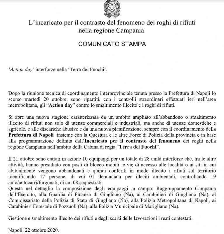 Pubblichiamo nota stampa dell'UFFICIO DELL'INCARICATO PER IL CONTRASTO DEL FENOMENO DEI ROGHI DI RIFIUTI NELLA REGIONE CAMPANIA