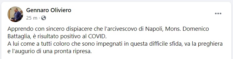 Questo quanto pubblicato sulla pagina fb del Pres. Consiglio Regione Campania Oliviero: "Apprendo con sincero dispiacere che l'arcivescovo di Napoli, Mons. Domenico Battaglia, è risultato positivo al COVID - si legge nella nota -. A lui come a tutti coloro che sono impegnati in questa difficile sfida, va la preghiera e l'augurio di una pronta ripresa."