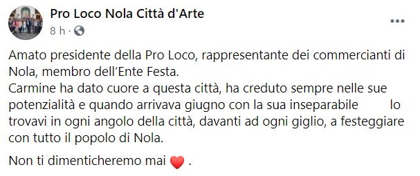 Questo il messaggio di cordoglio che apprendiamo dalla pagina facebook della Pro Loco di Nola: "Amato presidente della Pro Loco, rappresentante dei commercianti di Nola, membro dell’Ente Festa. Carmine ha dato cuore a questa città, ha creduto sempre nelle sue potenzialità e quando arrivava giugno con la sua inseparabile ... lo trovavi in ogni angolo della città, davanti ad ogni giglio, a festeggiare con tutto il popolo di Nola. Non ti dimenticheremo mai"