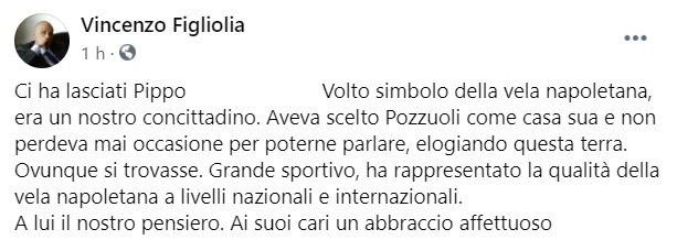 "Ci ha lasciati Pippo ... Volto simbolo della vela napoletana, era un nostro concittadino. Aveva scelto Pozzuoli come casa sua e non perdeva mai occasione per poterne parlare, elogiando questa terra. Ovunque si trovasse. Grande sportivo, ha rappresentato la qualità- si legge nella nota- della vela napoletana a livelli nazionali e internazionali. A lui il nostro pensiero. Ai suoi cari un abbraccio affettuoso"
