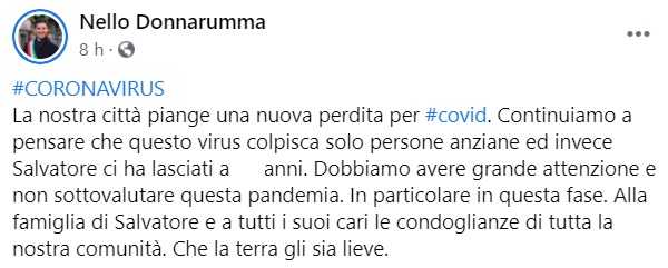 Questo il messaggio di cordoglio che apprendiamo dalla pagina facebook del Sindaco di Palma Campania Nello Donnarumma: "La nostra città piange una nuova perdita per covid. Continuiamo a pensare che questo virus colpisca solo persone anziane - si legge nella nota - ed invece Salvatore ci ha lasciati a ... anni. Dobbiamo avere grande attenzione e non sottovalutare questa pandemia. In particolare in questa fase. Alla famiglia di Salvatore e a tutti i suoi cari le condoglianze di tutta la nostra comunità. Che la terra gli sia lieve."