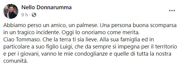 "Abbiamo perso un amico, un palmese. Una persona buona scomparsa in un tragico incidente. Oggi lo onoriamo come merita. Ciao Tommaso. Che la terra ti sia lieve. Alla sua famiglia ed in particolare a suo figlio Luigi, che da sempre- si legge nella nota- si impegna per il territorio e per i giovani, vanno le mie condoglianze e quelle di tutta la nostra comunità."