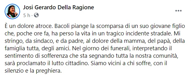 "È un dolore atroce. Bacoli piange la scomparsa di un suo giovane figlio che, poche ore fa, ha perso la vita in un tragico incidente stradale. Mi stringo, da sindaco, e da padre, al dolore della mamma, del papà, della famiglia tutta, degli amici. -Si legge nella nota- Nel giorno dei funerali, interpretando il sentimento di sofferenza che sta segnando tutta la nostra comunità, sarà proclamato il lutto cittadino. Siamo vicini a chi soffre, con il silenzio e la preghiera."