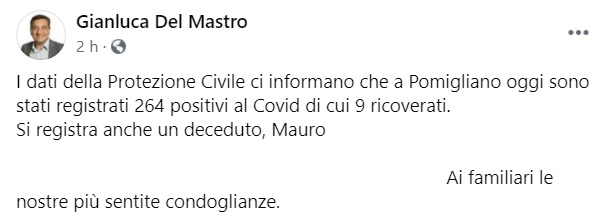 I dati della Protezione Civile ci informano che a Pomigliano oggi sono stati registrati 264 positivi al Covid di cui 9 ricoverati. -Si legge nella nota- Si registra anche un deceduto, Mauro ... Ai familiari le nostre più sentite condoglianze.