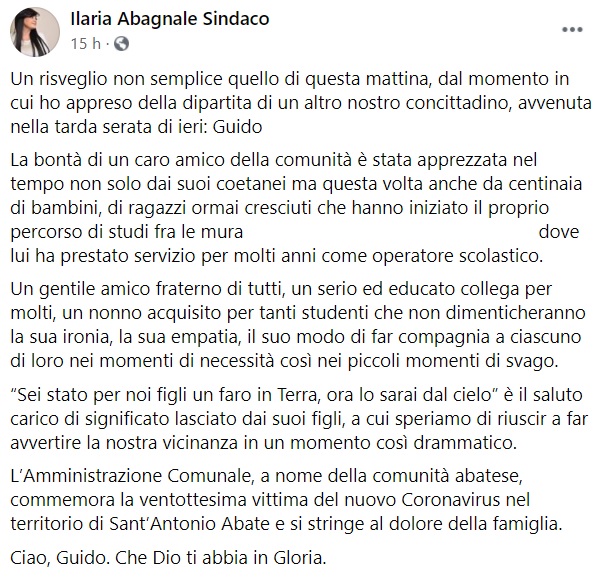 "Un risveglio non semplice quello di questa mattina, dal momento in cui ho appreso della dipartita di un altro nostro concittadino, avvenuta nella tarda serata di ieri: Guido ... La bontà di un caro amico della comunità è stata apprezzata nel tempo non solo dai suoi coetanei ma questa volta- si legge nella nota- anche da centinaia di bambini, di ragazzi ormai cresciuti che hanno iniziato il proprio percorso di studi fra le mura ... dove lui ha prestato servizio per molti anni come operatore scolastico. Un gentile amico fraterno di tutti, un serio ed educato collega per molti, un nonno acquisito per tanti studenti che non dimenticheranno la sua ironia, la sua empatia, il suo modo di far compagnia a ciascuno di loro nei momenti di necessità così nei piccoli momenti di svago. “Sei stato per noi figli un faro in Terra, ora lo sarai dal cielo” è il saluto carico di significato lasciato dai suoi figli, a cui speriamo di riuscir a far avvertire la nostra vicinanza in un momento così drammatico. L’Amministrazione Comunale, a nome della comunità abatese, commemora- si legge nella nota- la ventottesima vittima del nuovo Coronavirus nel territorio di Sant’Antonio Abate e si stringe al dolore della famiglia. Ciao, Guido. Che Dio ti abbia in Gloria."