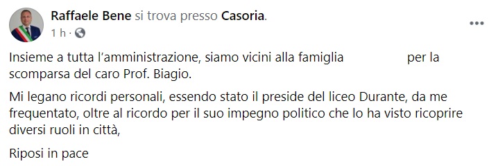"Insieme a tutta l’amministrazione, siamo vicini alla famiglia ... per la scomparsa del caro Prof. Biagio. Mi legano ricordi personali, essendo stato- si legge nella nota- il preside del liceo Durante, da me frequentato, oltre al ricordo per il suo impegno politico che lo ha visto ricoprire diversi ruoli in città .... Riposi in pace"