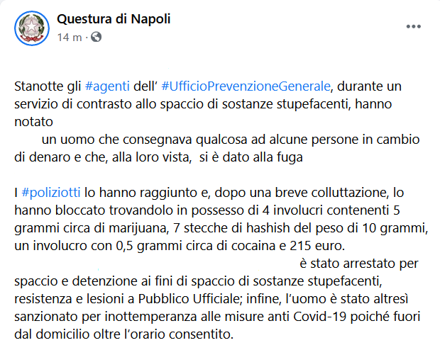 Questo il post pubblicato sulla pagina Facebook della Questura di Napoli. "Stanotte gli agenti dell’Ufficio Prevenzione Generale, durante un servizio di contrasto allo spaccio di sostanze stupefacenti, hanno notato (...) un uomo che consegnava qualcosa ad alcune persone in cambio di denaro e che, alla loro vista, si è dato alla fuga (...). I poliziotti lo hanno raggiunto e, dopo una breve colluttazione, lo hanno bloccato trovandolo in possesso di 4 involucri contenenti 5 grammi circa di marijuana, 7 stecche di hashish del peso di 10 grammi, un involucro con 0,5 grammi circa di cocaina e 215 euro. (...) è stato arrestato per spaccio e detenzione ai fini di spaccio di sostanze stupefacenti, resistenza e lesioni a Pubblico Ufficiale; infine, l’uomo è stato altresì sanzionato per inottemperanza alle misure anti Covid-19 poiché fuori dal domicilio oltre l’orario consentito".