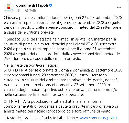 Lo apprendiamo dalla pagina Facebook del Comune di Napoli.