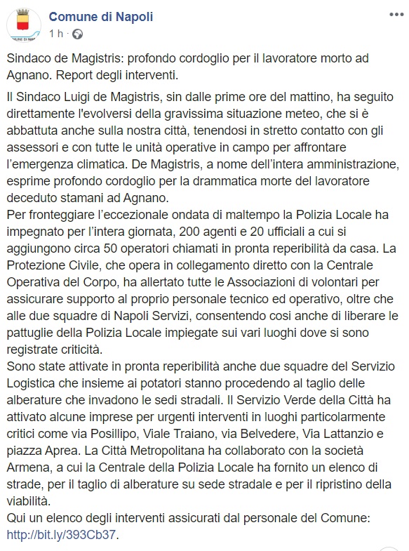 Questo quanto appreso dalla pagina Facebook del Comune di Napoli: