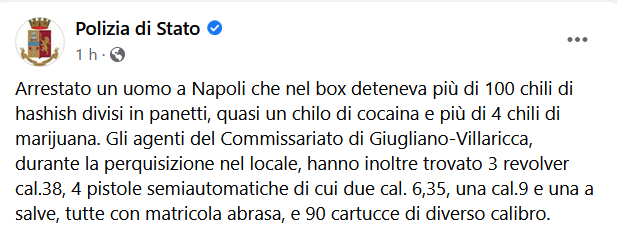 Questo il post pubblicato sulla pagina Facebook della Polizia di Stato: "Arrestato un uomo a Napoli che nel box deteneva più di 100 chili di hashish divisi in panetti, quasi un chilo di cocaina e più di 4 chili di marijuana. Gli agenti del Commissariato di Giugliano-Villaricca, durante la perquisizione nel locale, hanno inoltre trovato 3 revolver cal.38, 4 pistole semiautomatiche di cui due cal. 6,35, una cal.9 e una a salve, tutte con matricola abrasa, e 90 cartucce di diverso calibro - conclude il post".