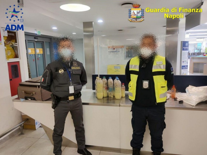 Il Comando Provinciale della Guardia di Finanza di Napoli, unitamente ai funzionari dell’Agenzia delle Dogane e dei Monopoli in servizio presso lo scalo aeroportuale di Capodichino, ha tratto in arresto due cittadini di origine africana che trasportavano complessivamente 11,300 kg di droga occultati all’interno dei bagagli da stiva.-spiega la nota-I due corrieri, un ... e un ..., giunti a Napoli con un volo proveniente da Parigi, stavano per lasciare l’Aeroporto quando sono stati fermati e sottoposti a controllo prima di allontanarsi dalla “sala arrivi”. -spiega la nota-In particolare, gli ufficiali addetti ai controlli, non convinti delle spiegazioni ricevute ed insospettiti da ulteriori segnali di “rischio”, hanno controllato i bagagli dei 2 soggetti rinvenendo 569 ovuli contenenti cocaina per un peso complessivo di -si legge nella nota-8,3 kg, e 3,1 kg di oppio all’interno di alcune bottiglie e confezioni per l’igiene intimo personale, pronti per essere distribuiti nelle “piazze dello spaccio” campane. -spiega la nota-L’elevata purezza dell’ingente quantitativo di droga sequestrata avrebbe consentito alle organizzazioni criminali di immettere sul mercato nazionale circa 300.000 dosi di droga per un guadagno complessivo di oltre 2 milioni di euro."