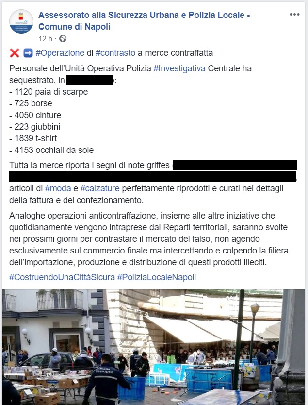 La Polizia Locale di Napoli è intervenuta in città sequestrato oltre 12 mila prodotti contraffatti, di varie marche.