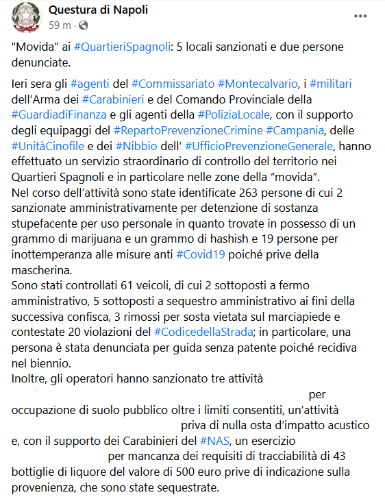 Questo il post pubblicato sulla pagina Facebook della Questura di Napoli: "'Movida' ai Quartieri Spagnoli: 5 locali sanzionati e due persone denunciate. Ieri sera gli agenti del Commissariato Montecalvario, i militari dell’Arma dei Carabinieri e del Comando Provinciale della Guardia di Finanza e gli agenti della Polizia Locale, con il supporto degli equipaggi del Reparto Prevenzione Crimine Campania, delle Unità Cinofile e dei Nibbio dell’ Ufficio Prevenzione Generale, hanno effettuato un servizio straordinario di controllo del territorio nei Quartieri Spagnoli e in particolare nelle zone della “movida”. Nel corso dell’attività - si legge nel post - sono state identificate 263 persone di cui 2 sanzionate amministrativamente per detenzione di sostanza stupefacente per uso personale in quanto trovate in possesso di un grammo di marijuana e un grammo di hashish e 19 persone per inottemperanza alle misure anti Covid-19 poiché prive della mascherina. Sono stati controllati - prosegue il post - 61 veicoli, di cui 2 sottoposti a fermo amministrativo, 5 sottoposti a sequestro amministrativo ai fini della successiva confisca, 3 rimossi per sosta vietata sul marciapiede e contestate 20 violazioni del Codice della Strada; in particolare, una persona è stata denunciata per guida senza patente poiché recidiva nel biennio. Inoltre - specifica il post - gli operatori hanno sanzionato tre attività (...) per occupazione di suolo pubblico oltre i limiti consentiti, un’attività (...) priva di nulla osta d’impatto acustico e, con il supporto dei Carabinieri del NAS, un esercizio (...) per mancanza dei requisiti di tracciabilità di 43 bottiglie di liquore del valore di 500 euro prive di indicazione sulla provenienza, che sono state sequestrate - conlcude".