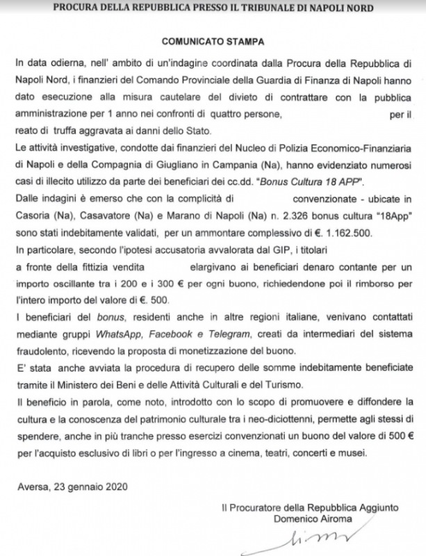 Pubblichiamo nota stampa della Procura di Napoli Nord