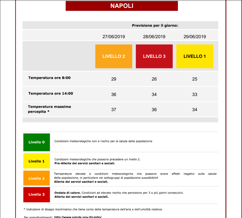 Riportiamo il bollettino delle ondate di calore pubblicato sul sito del Ministero della Salute: