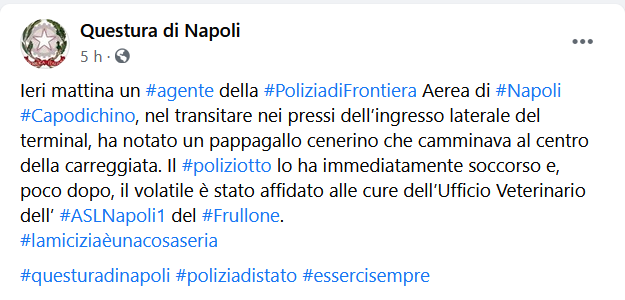 Questo il post pubblicato sulla pagina Facebook della Questura di Napoli: "Ieri mattina un agente della Polizia di Frontiera Aerea di Napoli Capodichino, nel transitare nei pressi dell’ingresso laterale del terminal, ha notato un pappagallo cenerino che camminava al centro della carreggiata. Il poliziotto - si legge nel post - lo ha immediatamente soccorso e, poco dopo, il volatile è stato affidato alle cure dell’Ufficio Veterinario dell’ ASL Napoli 1 del Frullone.