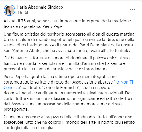 Questo il post pubblicato dal Sindaco di Sant'Antonio Abate Ilaria Abagnale