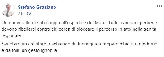 Questo il post pubblicato sulla pagina Facebook del Presidente della V commissione Sanità del Consiglio regionale della Campania Stefano Graziano: