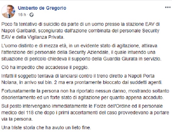Questo il post pubblicato sulla pagina fb del Presidente del Cda EAV, Umberto De Gregorio.