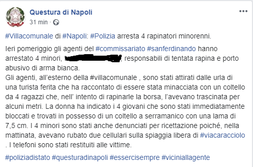 Questo il post pubblicato sulla pagina Facebook della Questura di Napoli: